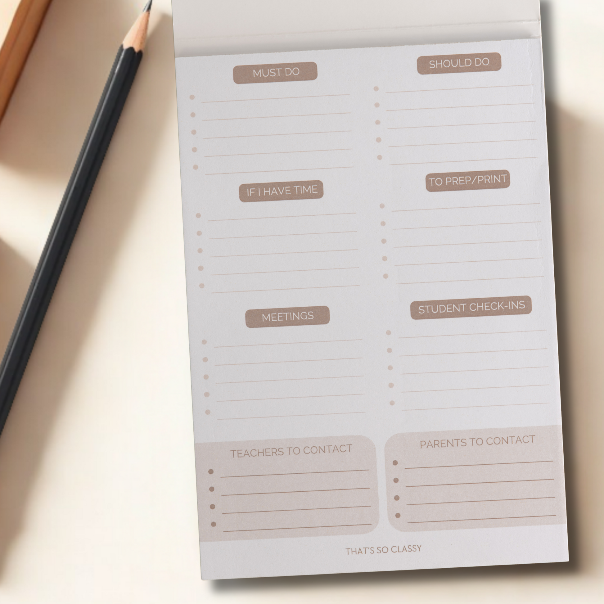 Stay organised and on top of your game with this sleek A5-sized to-do list notepad, created specifically for teachers. Thoughtfully designed to help you prioritise tasks with ease with practical sections like Must Do, Should Do, Meetings, Student Check-Ins, and more.